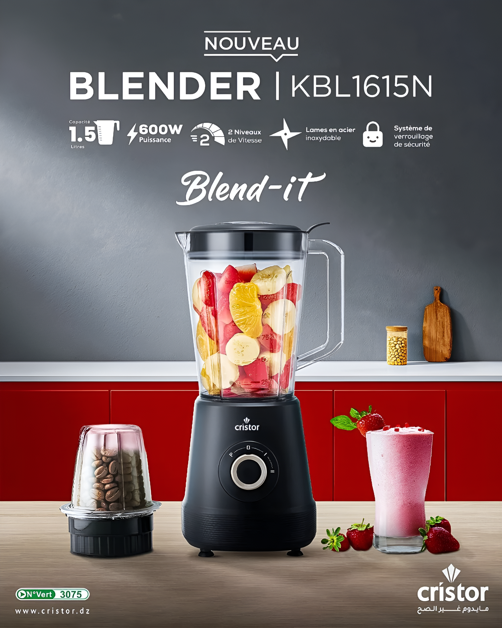 Découvrez notre Blender Cristor puissant 600W avec bol transparent plastique avec 1,5L, lames en acier inoxydable et fonction pulse pour des préparations ultra-rapides. Sécurité optimale grâce au verrouillage du bol et commande intuitive par bouton rotatif. Parfait pour smoothies, soupes et moutures (moulin inclus) – disponible en deux couleurs noir et blanc .